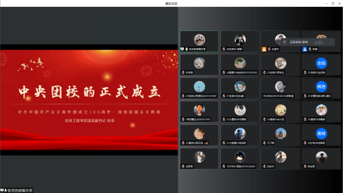 此次主题团日活动受疫情影响,采取线上云讲课与云分享的形式。学院团委副书记张荣讲授了《中央团校的正式成立》的微团课,带领现场青年同学深入了解了中央团校成立的历史背景,回顾了中央团校正式成立的那段岁月。随后,荣获校“疫情防控志愿服务先进个人”的李艳同学,分享了个人参与学校疫情防控志愿服务的工作经历与真情实感,号召大家在疫情期间做好个人防护,坚定战胜疫情的信心,传承好五四精神,让青春在战疫中闪光。