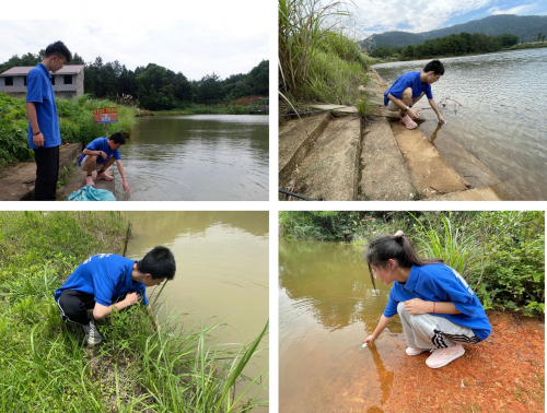 实践团成员在山塘边取水样