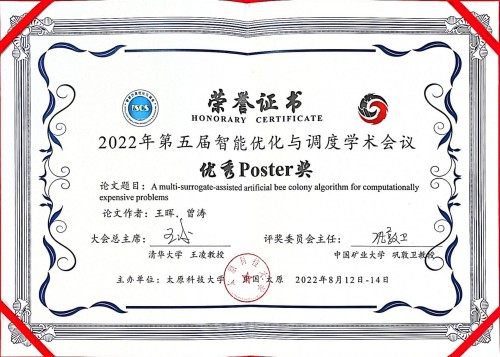 会上,学院王晖教授与其指导的研究生曾涛所撰写的论文《A multi-surrogate-assisted artificial bee colony algorithm for computationally expensive problems》,获得了“优秀Poster”奖。