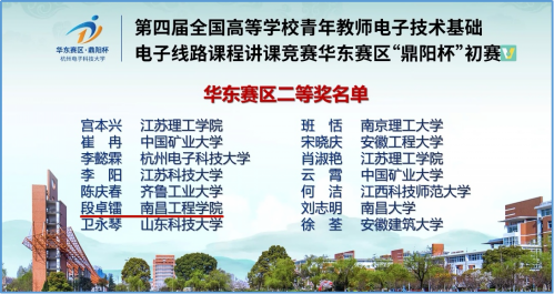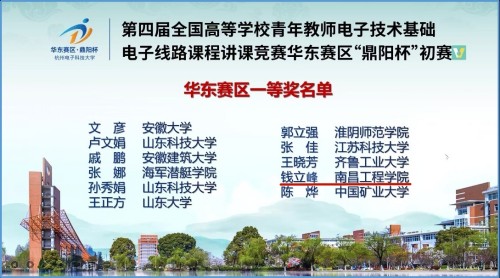 近日,从教育部高等学校电工电子基础课程教学指导委员会、中国电子学会电子线路教学与产业专家委员会、全国高等学校电子技术研究会传来喜讯,我校乐鱼(中国)官方青年教师钱立峰、段卓镭分别荣获第四届全国高等学校青年教师电子技术基础、电子线路课程讲课竞赛华东赛区“鼎阳杯”初赛一等奖、二等奖,创我校参加同类型同级别比赛获奖新高。钱立峰老师将代表我校参加全国总决赛。